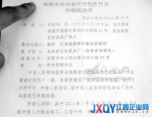 2012年5月17日,南康市勞動(dòng)爭(zhēng)議仲裁委員會(huì)作出的仲裁裁決書:家具廠老板鐘新民應(yīng)支付彭紹鳴勞動(dòng)報(bào)酬和經(jīng)濟(jì)補(bǔ)償金共計(jì)47932元。