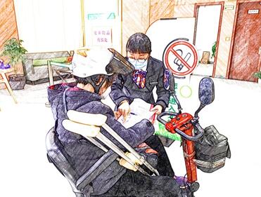 “您好!請問您需要辦理什么業(yè)務?”王劍習慣性回應道。只見那個阿姨坐在輪椅上,身體縮成了一團,孤零零一人在門口。見狀,王劍和同事呂霞馬上默契地快速走出門去迎接。